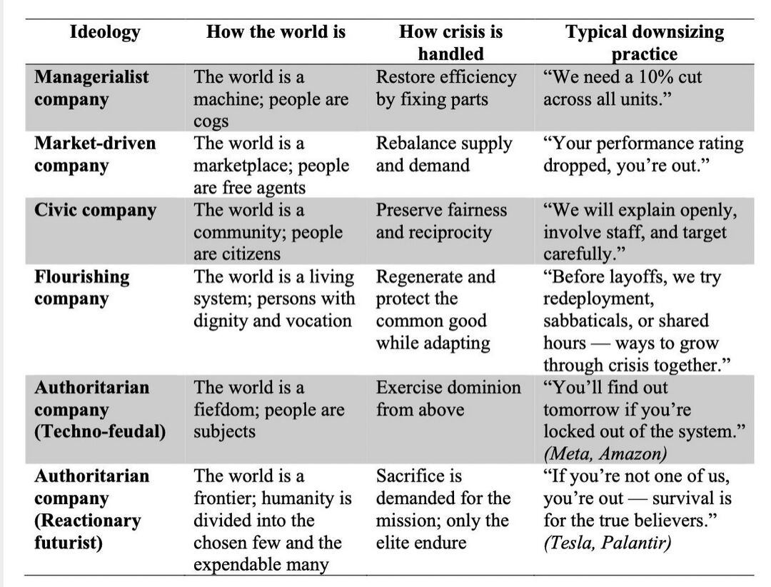 A ๐บ๐ฎ๐ป๐ฎ๐ด๐ฒ๐ฟ๐ถ๐ฎ๐น๐ถ๐๐ firm sees the world as a machine to be repaired. Downsizing is executed like a mechanic adjusting broken parts. A ๐บ๐ฎ๐ฟ๐ธ๐ฒ๐-๐ฑ๐ฟ๐ถ๐๐ฒ๐ป firm sees the world as a marketplace of individuals: layoffs become transactions, abrupt and performance-based. By contrast, a ๐ฐ๐ถ๐๐ถ๐ฐ company imagines itself as a community of citizens and aims for fairness, transparency, and reciprocity. A ๐ณ๐น๐ผ๐๐ฟ๐ถ๐๐ต๐ถ๐ป๐ด company sees itself embedded and generative, a steward for unlocking the good, enabled by persons with dignity and vocation, seeking to regenerate and protect the common good while adapting.