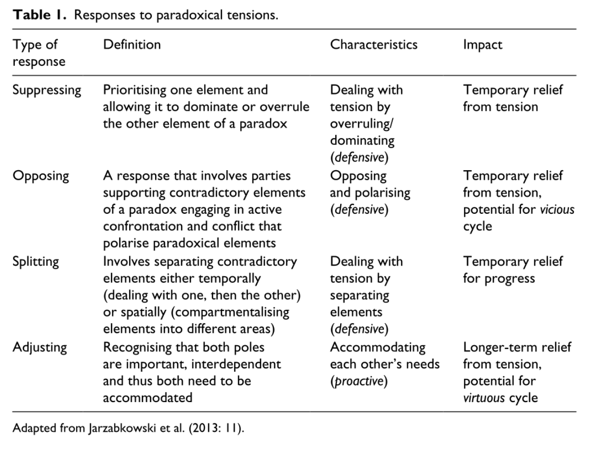 Hargrave and Van de Ven (2017) go further. They understand tensions as contradictions rooted in power relations. Paradoxical opposites – control and trust, efficiency and dignity, capital and labour – are not symmetrical. They reflect structural imbalances that are constantly reproduced by market logics and performance incentives.