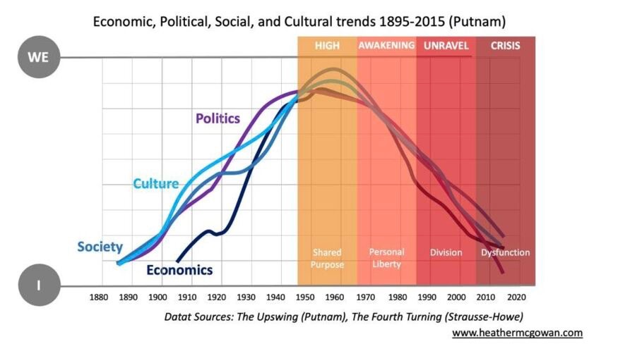 This curve, drawn from Robert Putnam’s latest work, shows how we have become strangers to one another in almost every sphere of life. Wealth and income inequality are rising. We no longer join the same associations - or for that matter any associations. We rarely marry across our siloes or gather for dinner across difference. And, very visibly in the US right now, we vote for entirely different worlds-to-come.