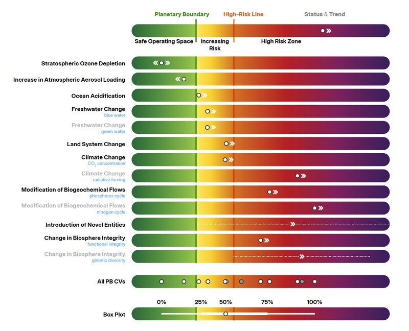 1️⃣ 7 of 9 planetary boundaries have now been breached (in 2024: 6 out of 9) — including climate change, biosphere integrity, land system change, freshwater, biogeochemical flows, novel entities, and ocean acidification.