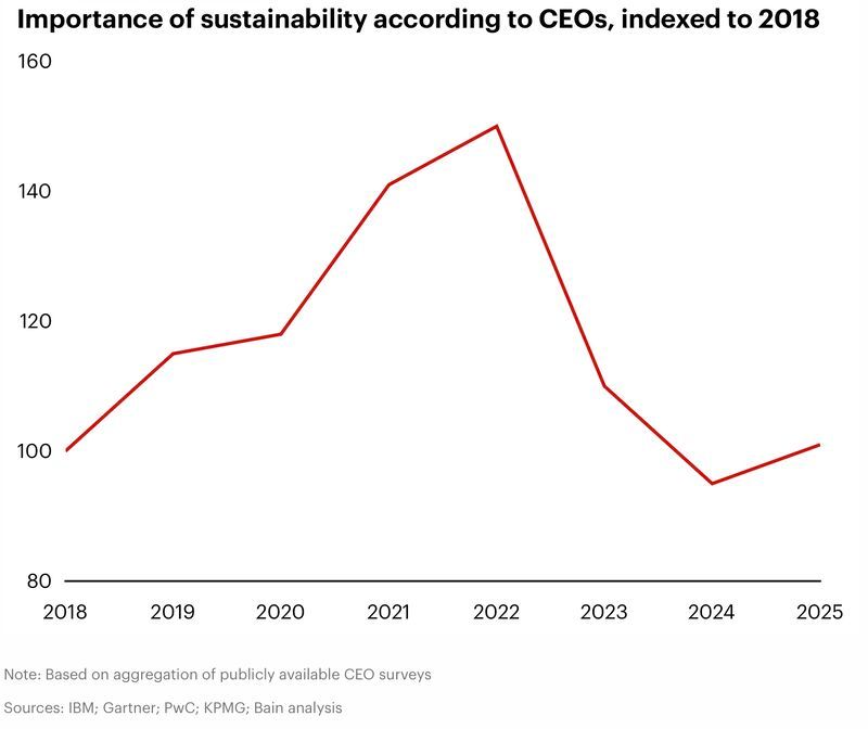 CEOs' prioritisation of sustainability is in sharp decline, according to an aggregated analysis of multiple CEO surveys by Bain & Co. The relative perceived importance of sustainability is overshadowed by growth concerns, AI, geopolitical issues, and inflation. But, this needs to be viewed in context...