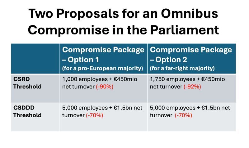Key disagreement is still around scoping. The EPP's latest "offer" is to exempt firms with less than 1,750 employees and with less than €450 million net turnover from the CSRD. The EPP also still wants to scrap mandatory climate transition plans.