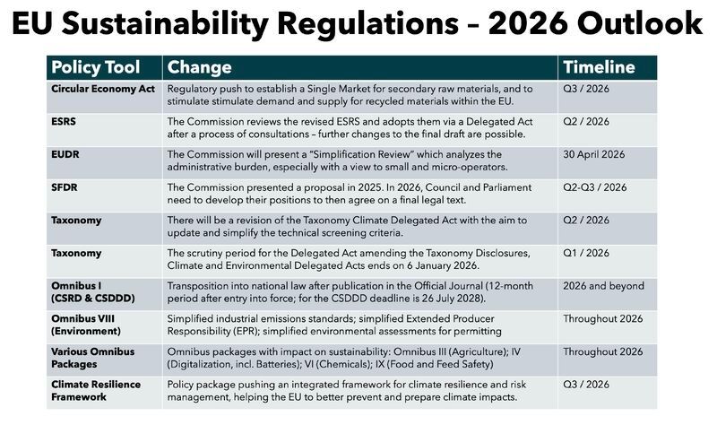 Omnibus I (CSRD & CSDDD) will move into national transposition, and it will be interesting to watch how Member States put the revised Directives into national law. The "Environmental Omnibus" will keep us busy in 2026, as it contains changes to key environmental laws (e.g. industrial emissions standards).
