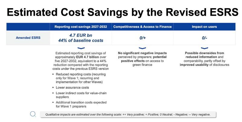 👉 Competitiveness effects are assessed as neutral. Companies themselves do not seem to think that significant competitiveness effects are created through ESRS simplification. A welcome reality check for all those politicians who are selling simplification as the way to boost competitiveness.