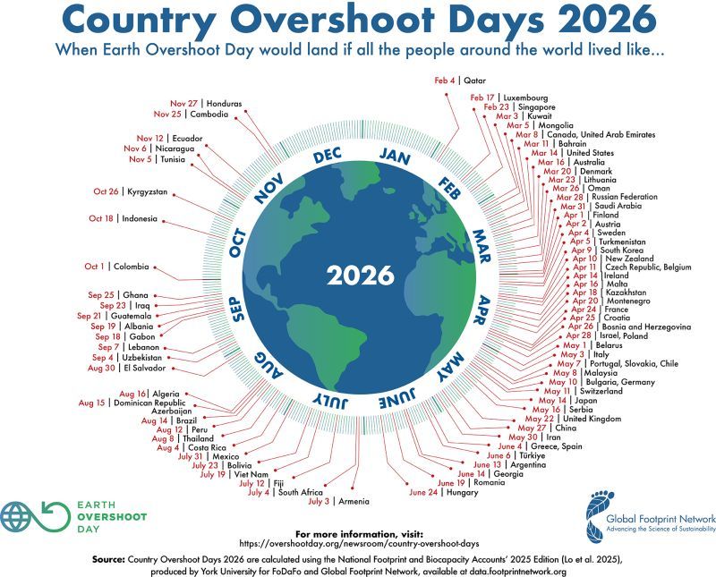A country's overshoot day marks the date when Earth’s annual biocapacity would be exhausted if everyone lived like the average resident of that country.