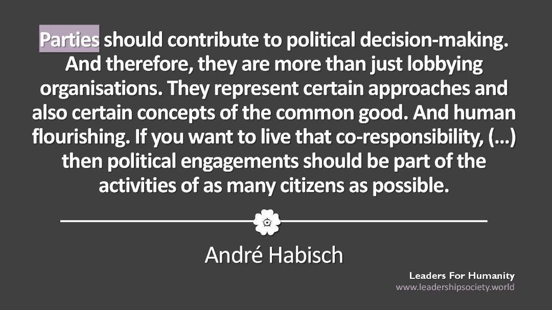 Additionally, André Habisch has actively collaborated with the German Bundestag as Expert Member in various Enquiry Commissions, from 1999 to 2002 and later from 2010 to 2013, translating his theoretical insights into practical applications. He also served as the Associate Research Director of the Academy Business in Society in Brussels between 2009 and 2016, and as the academic advisor to the German Federation of Catholic Entrepreneurs, further extending his influence in the realms of ethics, economics, and business. As a founding member of the Practical Wisdom Society, André is committed to a vision of society where entrepreneurial endeavors contribute to public welfare and development. He advocates for a new generation of ethical leaders who possess a deep understanding of their social and societal surroundings and recognize their inherent responsibilities to contribute to public welfare and development.