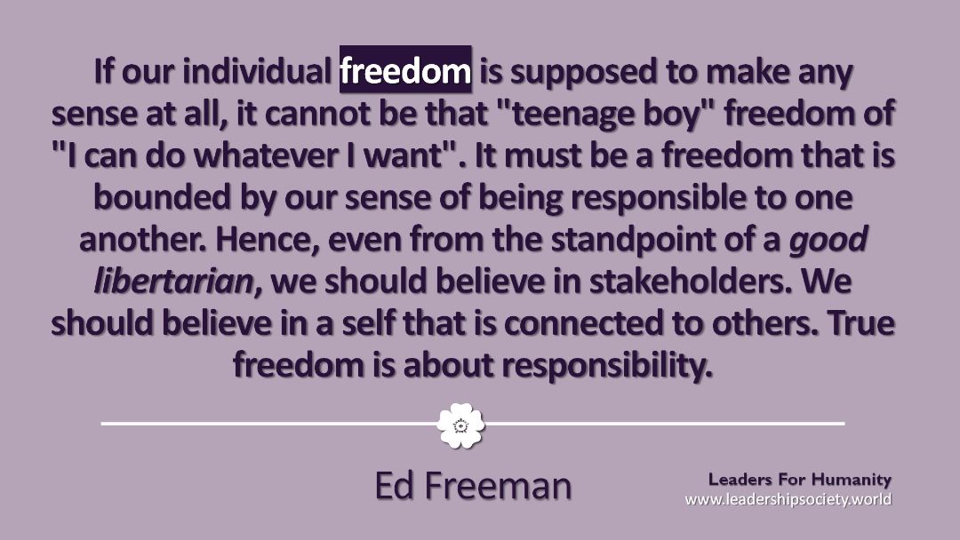 We approached Ed, because for nearly 50 years Ed has developed stakeholder theory (in spite of Klaus Schwab claiming it as his invention) as one of the most important narratives to counter a business ethic founded on single-minded shareholder value maximisation. Ed consistently emphasizes that ethics and value judgments are integral components of sound business decisions, rather than philanthropic add-ons (as he suggests CSR sometimes advocates) or undue taxation (as argued by Milton Friedman). Furthermore, Ed contends that stakeholder engagement can generate value for all parties involved. Finally, Ed is a convinced pragmatist, and his writings helped us much to see how pragmatism unfolds in practice, and where its limitations lie.